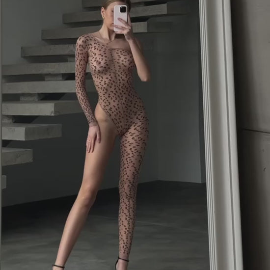The FELINE Bodystocking is an enchanting balance of mystery and allure, with its unique half-sleeve and single-leg design. Adorned with sparkling stones on every mesh detail and featuring a daring open crotch, this bodystocking is crafted to captivate and shine.