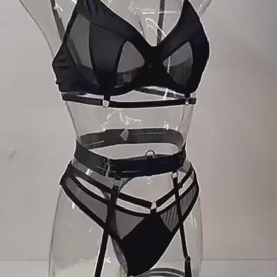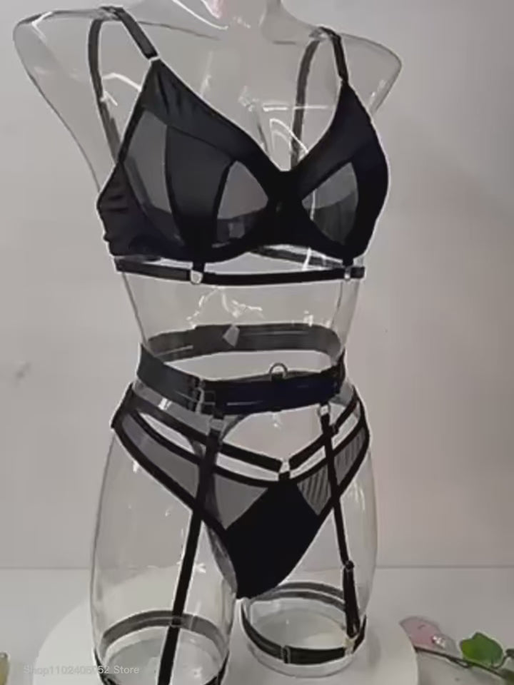 Unveil your confidence with the Midnight Allure Set, a timeless blend of elegance and desire. This set is crafted from sheer black mesh with delicate lace touches, creating a perfect balance between sensuality and sophistication. The underwire bra enhances your natural shape, while the high-waist panty sculpts a flattering silhouette. Strappy garter details add a daring edge, making every movement irresistibly alluring. Soft, breathable fabric ensures comfort while maintaining a luxurious feel against the skin. Designed for intimate moments yet versatile enough to elevate your everyday confidence, the Midnight Allure Set is your statement of irresistible charm and elegance.